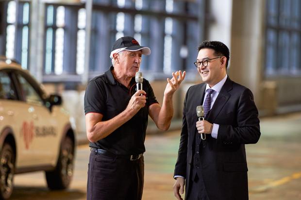 Kỷ lục gia Russ Swift cùng đại diện Tan Chong International tại khu vực trình diễn xe Subaru mạo hiểm quen thuộc.
