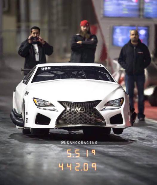 Trong màn chạy thử mới đây ngày 10/01/2017 ở đường đua Bahrain International Circuit, chiếc Lexus RC F độ xe đua Pro Drag của Ekanoo Racing đã hoàn thành 1/4 dặm (400m) trong thể thức đua drag chỉ mất 5,5 giây và vận tốc lên tới 447,39km/h - những con số phi thường. Thành tích này cũng khiến chiếc RC F độ này trở thành xe đua drag có cửa (thường xe đua drag chuyên nghiệp không có cửa) tăng tốc nhanh nhất và tốc độ tối đa cao nhất thế giới.