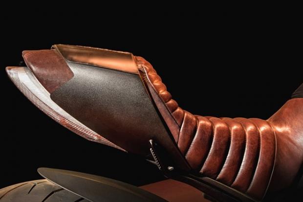 Yên xe bằng da thiết kế kim tự tháp DDD độc quyền, nơi đặt biển số gắn trên khung, chắn bùn trước cũng có thiết kế kiểu yên xe.