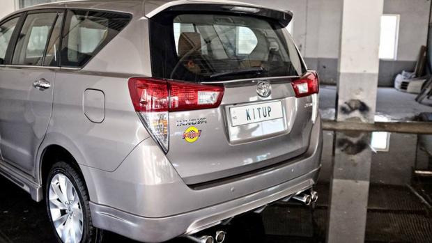 Bộ bodykit của Kit Up, mà thực chất là bodylip do chỉ ốp ngoài, đã biến Toyota Innova thành một mẫu xe trẻ trung và thể thao hơn. Cản trước được ốp thêm, nẹp hông và cản sau đi cùng bộ ống xả kép đôi đã giúp chiếc xe gia đình trở nên cứng cáp hẳn.