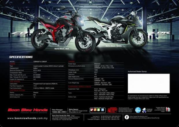 Honda Malaysia đã công bố giá bán cho CB650F 2017 ở mức 44.730RM (tương đương 226 triệu đồng) và CBR650F 2017 ở mức 46.850RM (tương đương 238 triệu đồng) kèm với chế độ bảo hành 2 năm hoặc 20.000km tùy thuộc điều kiện nào đến trước.