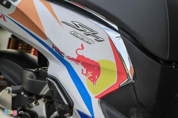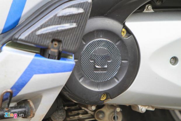 Lốc máy dán decal giả carbon, tuy nhiên chi tiết này chưa được trau chuốt nhiều nên vẫn hơi thô. Gác chân của người ngồi sau được sơn carbon chất liệu tốt hơn.