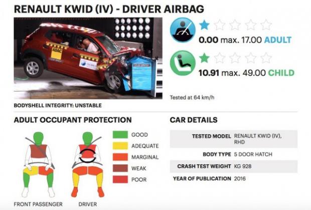 Trong thử nghiệm khả năng bảo vệ hành khách trưởng thành (AOP) và trẻ em (COP) của Global NCAP, Renault Kwid chỉ được đánh giá 1 sao an toàn. Chiếc xe này chỉ có 1 túi khí và dây đai an toàn tự căng dành cho người lái. Điều đáng nói là chiếc xe tham gia thử nghiệm thuộc bản có trang thiết bị an toàn cao nhất của dòng Renault Kwid tại Ấn Độ.