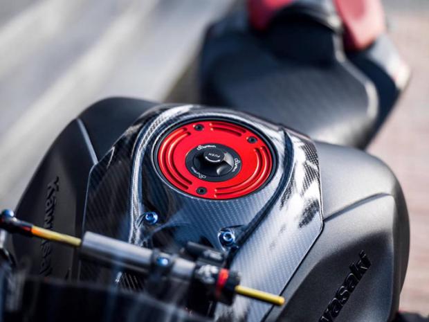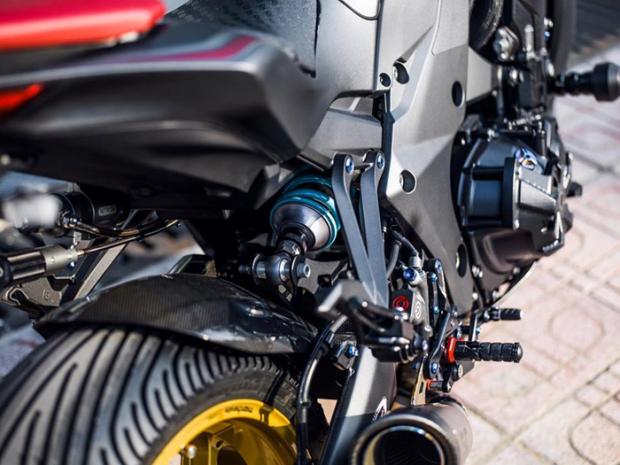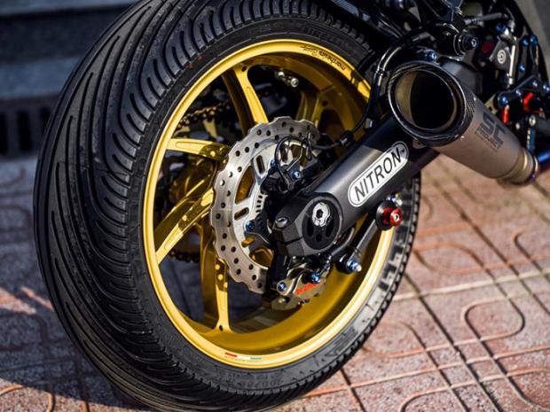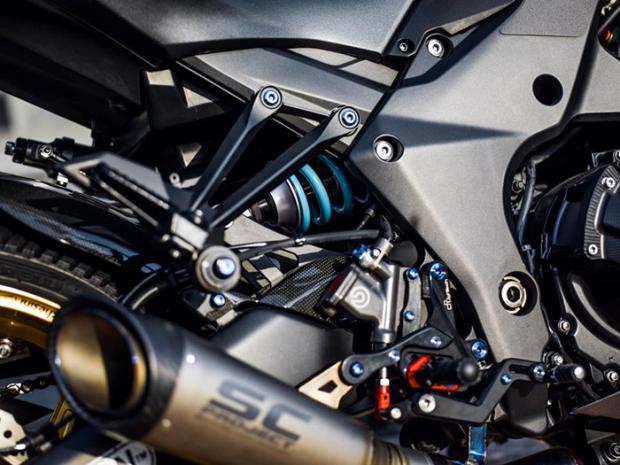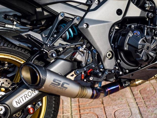 Ngoài ra, 'mãnh thú' này còn sử dụng bộ gác chân, số gảy Lightech R Version, pen đạp Brembo Billet và ống pô SC Project S1. Ống pô này được gia công bằng titan kết hợp carbon cho ra loại âm thanh cực kì uy lực và hấp dẫn. Ngoài những món đồ trên, Taboo vẫn lưu ý giảm trọng lượng xe khi trang bị khoảng 200 con ốc titanium Grade 5 siêu nhẹ cho chiếc Z1000 này, kèm theo đó là bộ nắp xăng Lightech được CNC bằng nhôm nhẹ.