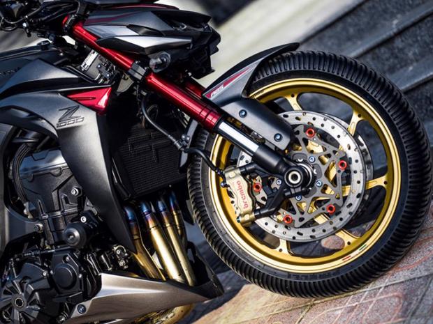Z1000 sở hữu ngôn ngữ thiết kế Sugomi nên bản thân xe rất khác biệt, cực kì hầm hố và cuốn hút người nhìn. Với những gì Kawasaki mang lại, chủ xe còn tăng cường thêm kính gió Puig cỡ lớn phía trước để tăng vẻ dữ tợn cho xe. Bên cạnh kính gió này, xe sử dụng bộ cùm thắng Brembo Billet HP cho khả năng xử lý tình huống nhanh lẹ và an toàn. Bộ cùm này đi chung với cặp heo trước Brembo Billet HP 4-piston và đĩa thắng Brake Tech USA. Có thể nói đây là sự kết hợp đình đám trong làng độ mô tô phân khối lớn hiện nay.