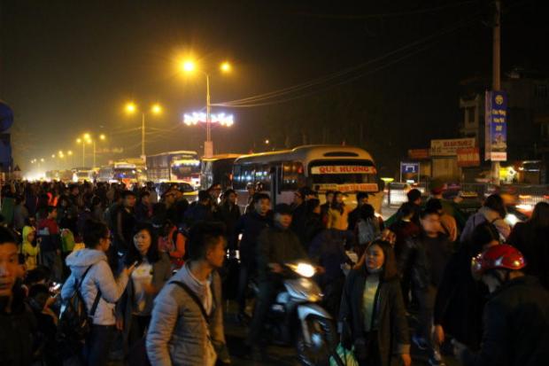 Ôtô, taxi, xe khách đậu hàng dài, cộng với việc người dân tràn ra đường bắt xe cho kịp giờ làm việc khiến khu vực trước bến xe Nước Ngầm ùn tắc từ sáng - Ảnh: Hà Thanh