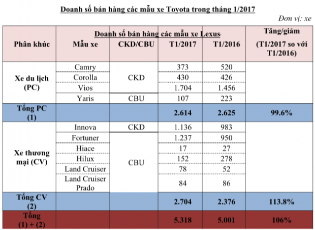 Các mẫu sedan du lịch gồm: Camry, Corolla, Vios, Yaris bán ra chiếm 49% tổng lượng tiêu thụ của Toyota Việt Nam (TMV), tương đương 2.614 xe. Những mẫu xe được xếp ở phân khúc xe thương mại gồm: Innova, Fortuner, Hiace, Hilux, Land Cruiser và Land Cruiser Prado chiếm một nửa lượng tiêu thụ so trong tháng 1/2017.