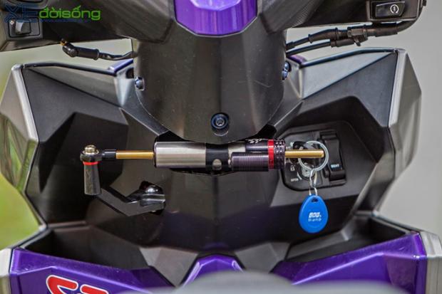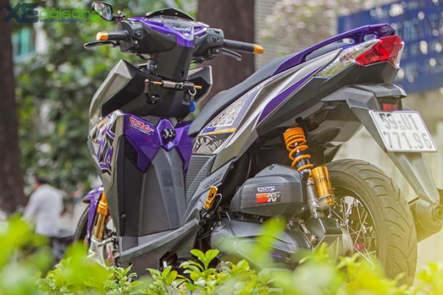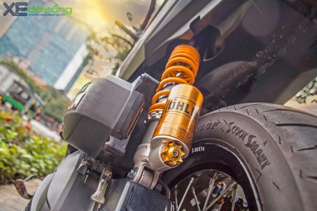 Bên cạnh 'chân' trước đẳng cấp, phía sau xe trang bị phuộc đơn Ohlins cho cảm giác vận hành cực kì êm ái và dễ chịu. Điểm nhấn phía sau của xe cũng là điểm làm nên thương hiệu cho chủ xe khi Click 125i được trang bị gắp CNC nguyên khối với các patch heo dầu, patch pen dầu mặc định như hàng 'Full system' độ sẵn cho xe. Bộ gắp này hiện nay xuất hiện khá nhiều trên các dòng xe tay ga độ.