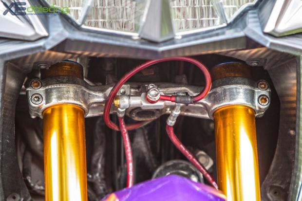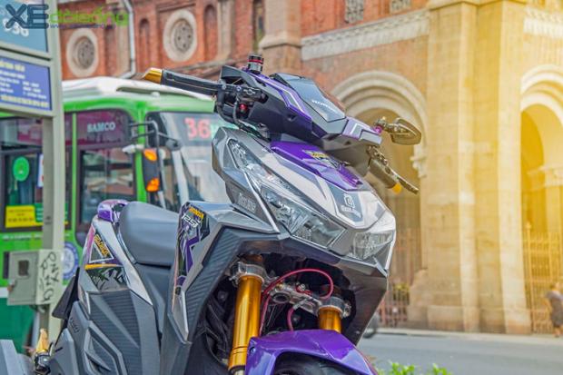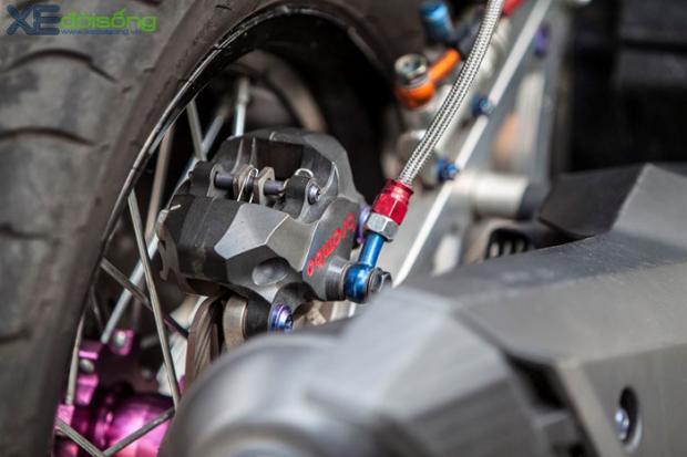 Đầu tiên, dàn 'chân' trước gây ấn tượng không nhỏ khi xe lăn bánh trên phố. Chiếc xế độ này sử dụng cặp phuộc upside-down thừa hưởng từ các mẫu mô tô hạng nặng, nhưng được độ chế lại sao cho phù hợp với chiếc tay ga cỡ nhỏ thành thị. Ngoài ra, chân phuộc được CNC sắc sảo với patch gắn heo và logo Ohlins đặc trưng. Với cặp phuộc này, xe sử dụng đĩa thắng kép phía trước với hai đĩa Galfer size 245mm, hai kẹp phanh Brembo M50 (mẫu M50 là mẫu sử dụng mặc định trên Z1000R 2017 và Kawasaki ZX10R 2016). Hệ thống thắng trước này được phân bổ qua cùm thắng Brembo với bộ chia dầu lấy từ các dòng Superbike 1000cc.