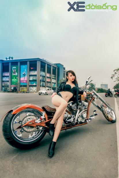 Mẫu chooper từng gặt hái giải thưởng “xế độ” 5 năm liên tiếp của nhà sản xuất custom-bike nổi tiếng hàng đầu tại Mỹ - Big Bear Chopper giúp Ngân Lee cực kỳ sexy trong bộ ảnh mới nhất.