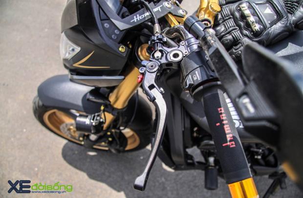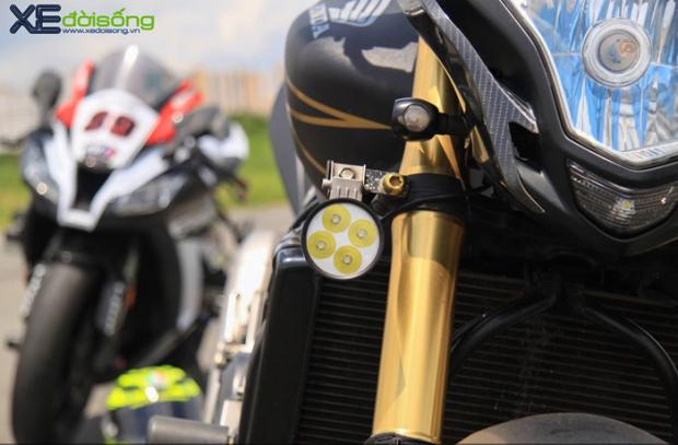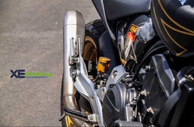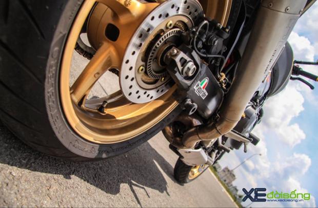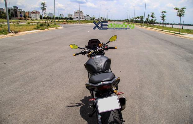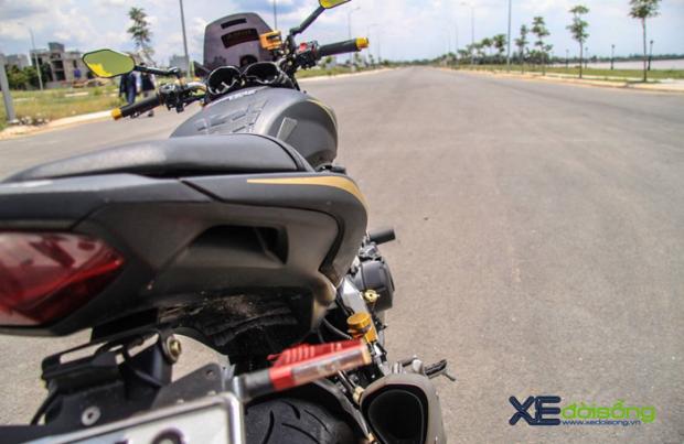 Phía sau xe, biker trẻ trang bị 'khẩu thần công' - ống xả HP Corse bằng chất liệu titanium cho ra loại âm thanh ấm và uy lực như những xe chạy sân chuyên nghiệp. Hệ thống trợ sáng trên xe sử dụng đèn LED L4 siêu sáng, có tác dụng phá tan sương mù và hỗ trợ ánh sáng cực kì hiệu quả ở những đoạn đường tối. Signal rời sử dụng trên xe là loại Rizoma Drop (phía trước) cùng Rizoma Graffio (phía sau). Signal của Rizoma cho ra ánh sáng vàng cam rất chói và có tầm nhìn xa, điểm đặc biệt này của Rizoma đảm bảo an toàn cho tay lái khi chạy tour xa ở những tình huống phức tạp.
