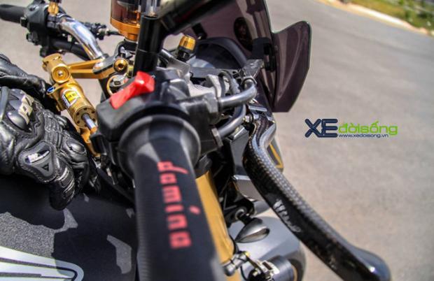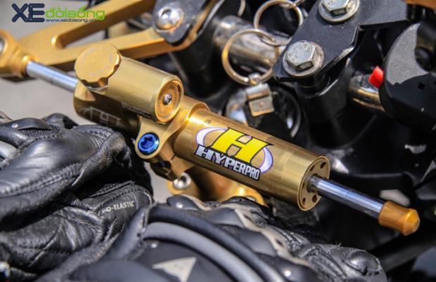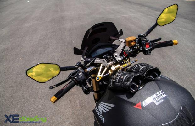Phần đầu xe được chăm sóc tỉ mỉ với kính gió hand-made độc đáo, bộ khung ốp choá đèn được phủ sợi carbon cao cấp khiến chiếc xe trông dữ dằn và phá cách hơn. Trên ghi đông, xe trang bị trợ lực tay lái Hyper Pro để đảm bảo an toàn ở dãy vận tốc cao, trợ lực này giữ nhiệm vụ giúp ổn định và cân bằng tay lái khi xe đạt ngưỡng tốc độ và vòng tua máy cao. 2 bên tay lái, xe sử dụng bao tay Domino Italy, gù cân lái Rizoma và gương hậu Rizoma Ellise cỡ lớn, cặp gương này cho tầm nhìn thoáng và bao quát sâu giúp người lái dễ dàng kiểm soát nhiều tình huống trên đường.