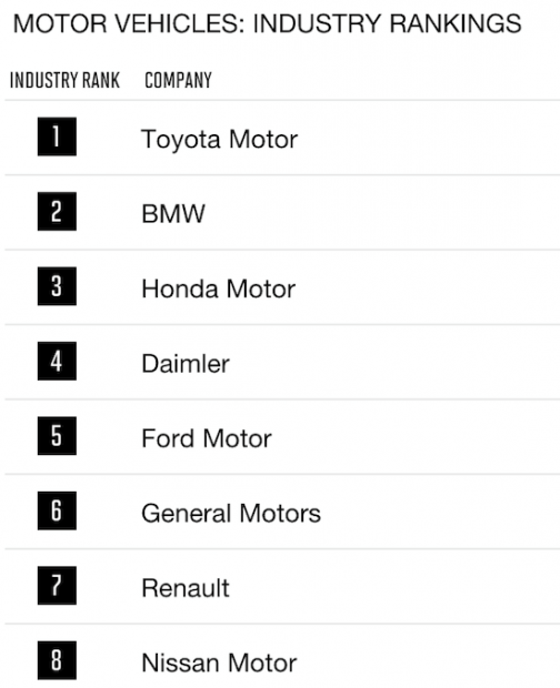 Trong danh sách này chỉ có 2 hãng xe, BMW, xếp thứ 21, và Toyota, thứ 34. Trong khi đó, xét riêng trong ngành công nghiệp sản xuất ôtô, Toyota đứng số 1, và BMW số 2.
