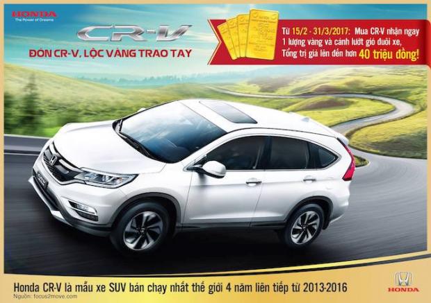 Mới nhất là Honda CR-V với chương trình hấp dẫn “Lộc vàng đầu xuân” dành cho khách hàng mua Honda CR-V trong thời gian từ ngày 15/2/2017 đến hết ngày 31/3/2017. Cụ thể, trong khoảng thời gian trên, khách hàng mua xe Honda CR-V và hoàn tất thủ tục thanh toán 100% trong thời gian khuyến mại sẽ được nhận bộ “lộc vàng” may mắn đầy hấp dẫn với tổng giá trị lên tới gần 45 triệu đồng, bao gồm: một lượng vàng SJC 9999; một phụ kiện trang trí chính hãng là cánh lướt gió đuôi xe cùng với tiền công lắp đặt trên chiếc xe mà khách hàng đã mua.
