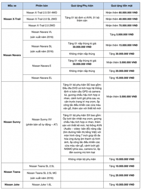 Khi mua bất kì phiên bản nào của các dòng xe Nissan X-Trail, Navara, Sunny, Teana hay Juke, khách hàng đều được tặng kèm quà tặng hay phụ kiện giá trị, thêm quà tặng tiền mặt trị giá hàng chục triệu đồng.