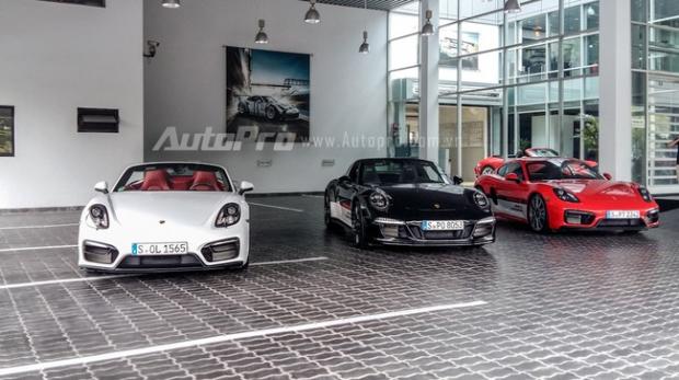 Bộ 3 xe thể thao cao cấp Porsche Cayman GTS đỏ, 911 Targa 4 GTS đen bóng và Cayman GT4 trong bộ áo trắng muốt.