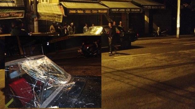 Chiếc xe gây tai nạn bị người dân đập nát mặt kính.