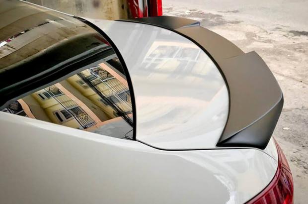 Ấn tượng mạnh là thiết kế của cản trước với phần 'mũi' được tạo hình kiểu cách, đèn LED định vị bố trí theo chiều đứng 2 bên mép, các hốc hút gió lớn và cánh gió cản trước. Cản sau thiết kế phong cách thể thao như những chiếc xe đua, chụp ống xả 4 đầu tròn bắt mắt. Hiện tại chiếc xe đang sử dụng bộ mâm zin, tuy nhiên tới đây sẽ được thay thế bằng bộ mâm cách điệu hơn.