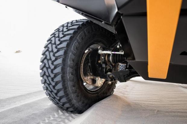 Chính giữa gầm máy là tấm kim loại chống va chạm gầm xe trong trường hợp leo dốc cao có đá tảng. Bánh xe được thay mới hoàn toàn bằng loại vành chuyên dụng Metnod kích thước 18 inch đi cùng lốp xe thể thao Toyo khiến cho chiều cao và khoảng sáng gầm xe tăng lên đáng kể.