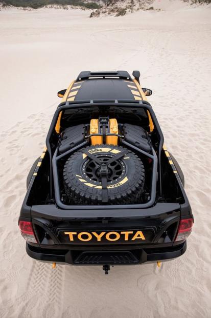 Phía sau của Hilux Tonka cũng được thay đổi ở nắp thùng với 2 khe gió và ốp đèn hậu tạo vẻ dữ dằn. Cánh gió trên thùng xe và bộ lồng kim loại vừa có tác dụng giữ đồ, để lốp dự phòng lại tăng khả năng bảo vệ trong trường hợp lật xe. Ngoài ra, dưới cản sau còn được trang bị 3 móc kéo, phục vụ khả năng cứu hộ trên cát.