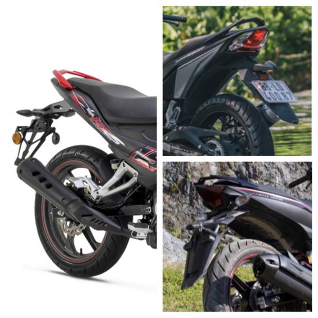 Phần đuôi xe, Benelli RFS150i khác biệt với thiết kế đế gắn biển số cùng cụm đèn hậu rất giống phong cách xe phân khối lớn. Tuy nhiên, chắn bùn phía sau khá ... 'hở hang' có thể khiến nhiều người đặt câu hỏi về khả năng chắn bụi bẩn bắn lên khi xe vận hành. Mẫu côn tay 150cc mới của Benelli sử dụng bánh trước sau lắp lốp kích thước 70/90-17 và 120/70-17, tương tự cấu hình lốp của Yamaha Exciter. Phanh đĩa phía sau có đường kính 220mm, kẹp phanh 2 piston. Nhìn chung, Benelli RFS150i có thiết kế và kích thước tương đồng với Exciter và Winner. Tuy nhiên, mẫu underbone mới của Benelli có phần hấp dẫn hơn với những trang bị trên xe giá trị hơn so với đối thủ.