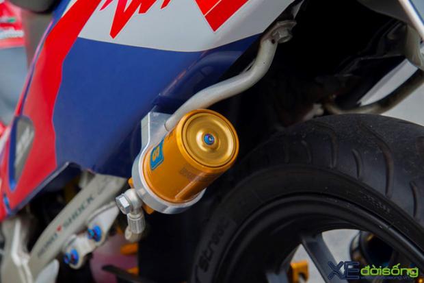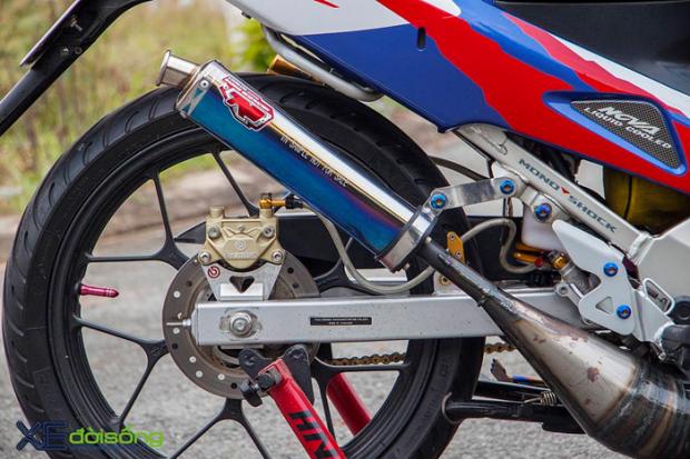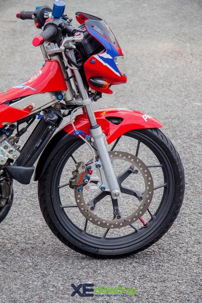 Bên trái ghi đông là cùm côn CRG GP giúp giữ tay côn mượt mà hơn, tăng khả năng vào số nhanh cho xe. Như đã biết, chiếc Nova này được độ lại dàn máy để tăng khả năng bứt tốc, và cỗ máy 2 thì này sẽ cho ra âm thanh khiêu khích qua ống xả R9 Titanium cùng bộ pô bụng thừa hưởng từ Yamaha Z125 (YaZ). Treo sau thay đổi với phuộc Ohlins bình gas rời giúp cân bằng xe ổn định khi vào cua và thắng sau cũng được thay đổi với kẹp phanh Brembo 2 piston đối xứng.