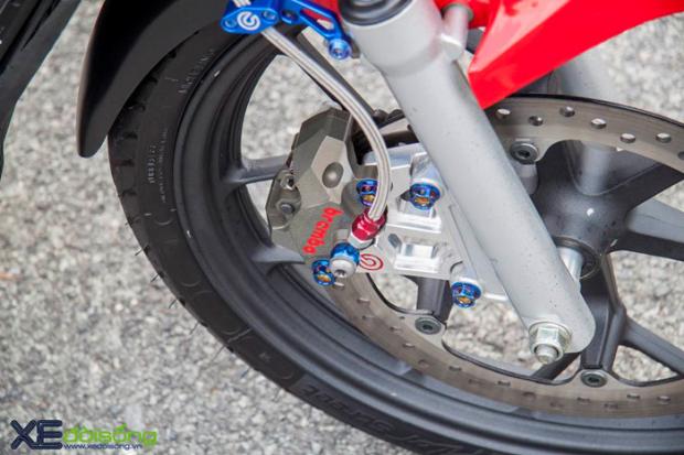 Phía trước xe, bộ mâm 'zin' được thay thế bằng mâm của Sonic 150 Fi mới đi kèm phanh Brembo Billet, bộ phanh này kết hợp với cùm Brembo Classic, càng thắng CRG Folding cho cảm giác bóp thắng nhẹ nhàng và lực ép từ piston của Brembo giúp xe không rung lắc ở những tình huống khẩn cấp. Trên ghi đông, xe sử dụng bao tay Domino, gù cân lái Rizoma và trợ lực trung tâm Ohlins. Bộ trợ lực này có tác dụng giữ cho cổ xe thẳng và không bị rung động khi vận hành ở vận tốc cao.