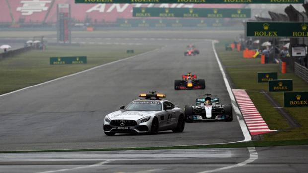 Cuộc đua chặng Chinese GP đã có nhiều tình huống bất ngờ ngay khi bắt đầu những vòng đua đầu tiên. Lance Stroll (đội William Mercedes) đã bị chệch ra khỏi đường đua sau khi xuất phát không lâu. Sau đó, tay đua của Sauber là Antonio Giovinazzi đã gặp tai nạn khi các đối thủ đang chạy vòng 4. Thời tiết xấu khiến mặt đường đua trơn trượt chính là nguyên nhân ban đầu làm các tay đua gặp những tình huống không mong muốn. Đồng đội của Hamilton là Valtteri Bottas cũng đã gặp tình huống mất kiểm soát chiếc Mercedes trên mặt đường trơn nhưng anh may mắn không phải chịu sự cố đáng tiếc nào. Xe an toàn Safety Car đã ngay lập tức vào dẫn đoàn đua khiến vị trí của các tay đua không có thay đổi.