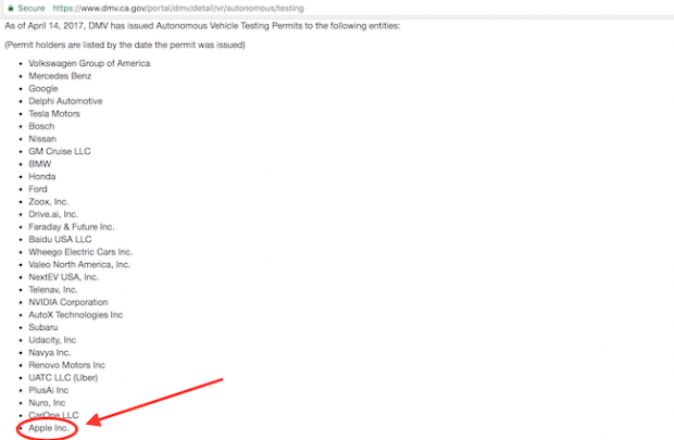 Xuất phát từ một danh sách cấp phép chạy thử nghiệm xe tự lái do Cơ quan Quản lý các phương tiện Cơ giới California (DMV) loan báo hôm 14/4/2017, Apple nằm chung giấy phép cấp dịp này với 30 thương hiệu khác gồm cả các công ty công nghệ như Google, Baidu...hay các hãng xe tên tuổi như Mercedes-Benz, Tesla, BMW, Volkswagen...