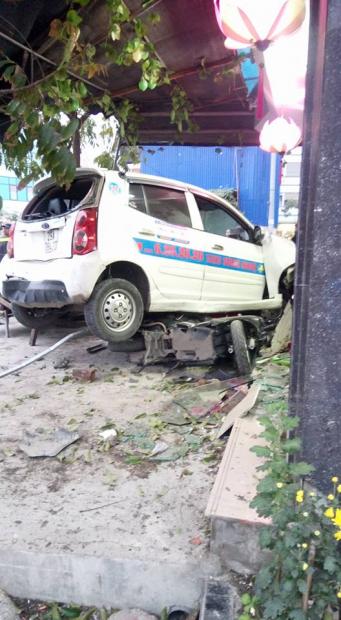 Tại hiện trường vụ tai nạn, chiếc xe taxi nằm đè lên hai chiếc xe máy, ngay trước cửa một nhà dân. Chiếc taxi bị hư hỏng đáng kể, cả đầu và đuôi xe.