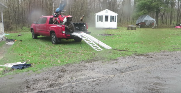 Clip do một biker lớn tuổi ở Mỹ tự quay lại cảnh mình đưa chiếc xe cào cào Honda XR650R lên thùng sau xe bán tải Toyota Tacoma TRD.