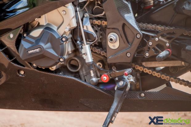 Nhằm bảo vệ tuyệt đối cho những món đồ trên xe, S1000RR sử dụng theo ốp nồi GB Racing, chống đổ toàn thân Performane và bộ bảo vệ càng thắng thừa hưởng từ Lightech. Ngoài ra, chiếc xế độ cũng được tinh chỉnh lại phần “nội công” nhằm gia tăng công suất vận hành, âm thanh từ cỗ máy 4 xy-lanh inline sẽ thoát ra hoành tráng cùng ống pô Austin Racing GP1R. Bộ pô này sử dụng chất liệu carbon ở phần lon và toàn bộ cổ pô bằng hợp kim titan chắc chắn.