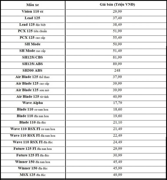 Bảng giá chi tiết của các mẫu xe máy của Honda trong tháng 6/2017: