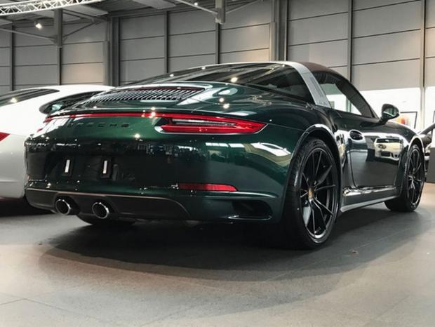 Ngay từ ánh nhìn đầu tiên, chiếc Porsche 911 (991.2) Targa 4 này đã khác biệt với những chiếc xe khác nhờ bộ cánh màu xanh lá đậm PTS British Racing Green hay còn gọi là PTS Oliv-Green.