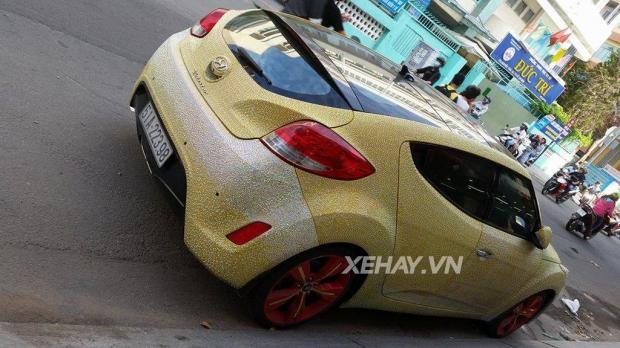 Hyundai Veloster là mẫu hatchback thời trang nhưng không quá đắt tiền, có giá khoảng 840 triệu đồng tại thị trường Việt Nam. Chiếc xe của một người dùng tại TP. Hồ Chí Minh thu hút sự chú ý đặc biệt bởi ý tưởng 'không đụng hàng'. Chủ nhân chiếc xe đã cho đính hàng nghìn viên pha lê bên ngoài thân xe với hai tông màu chính là trắng và vàng.