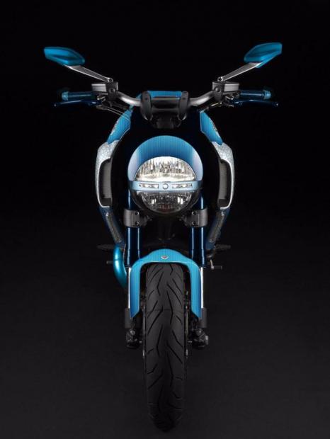 Sở hữu màu xanh da trời kết hợp cùng sắc bạc, Garage Italia Diavel gây ấn tượng với những đường nét trang trí tinh xảo bằng sợi carbon, nhôm đan Alutex và Alacantra - một loại vật liệu sợi nhỏ thường được sử dụng trong ngành công nghiệp ô tô và hàng hải. Đây chính là sự điều chỉnh toàn diện của chiếc cruiser cơ bắp đến từ Bolognese.