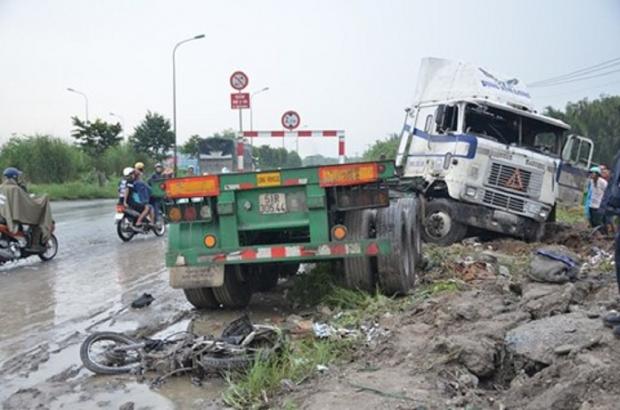Cú tông mạnh khiến 2 người đi trên 2 xe máy bị xe container cuốn vào gầm. Vụ việc khiến 1 người tử vong tại chỗ, riêng người còn lại nguy kịch được người dân đưa đi cấp cứu tại bệnh viện nhưng tử vong sau đó.
