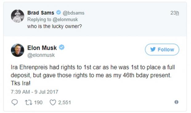 Ai có thể sở hữu chiếc Tesla Model 3 (bản thương mại) đầu tiên? Đó chính là Ira Ehrenpreis, một nhà đầu tư công nghệ tại Technology Partners và ông đã gửi nó làm món quà sinh nhật 46 tuổi cho chính CEO Tesla, Elon Musk.