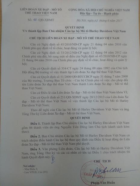 Ngày 13-6-2017, ông Phạm Văn Huấn, Chủ tịch Liên đoàn Xe đạp- Mô tô thể thao Việt Nam chính thức ký Quyết định số 89/QĐ-XĐMT: “Về việc công nhận Điều lệ của CLB Mô tô Harley Davidson Việt Nam”. Điều lệ này thay thế cho Điều lệ trước đây của CLB. Cũng trong ngày này, ông Phạm Văn Huấn ký Quyết định số 90/QĐ-XĐMT: 'Thành lập Ban Chủ nhiệm CLB Mô tô Harley Davidson Việt Nam gồm 06 thành viên do ông Nguyễn Tiến Dũng làm Chủ tịch'. Các Phó chủ tịch gồm: ông Lê Thắng, Nguyễn Hữu Hồng Thanh, Phan Minh Tuấn, bà Bùi Thị Thu Huyền và Phó chủ tịch thường trực là ông Nguyễn Tuấn Anh.