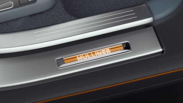 Các chi tiết cản trước và đường viền quanh xe được thiết kế với màu sắc bắt mắt. Vào ban đêm, đèn LED phía dưới cánh cửa phản chiếu cụm từ 'Mulliner' trên mặt đất khi khách hàng mở cửa xe. Đặc biệt nhất là việc thân xe sử dụng các chất liệu Titanium kết hợp với sợi Cacbon tổng hợp cao cấp.