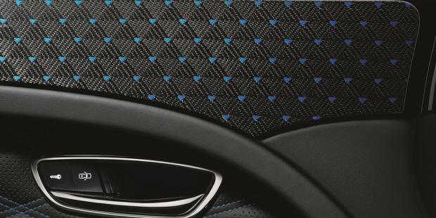 Nội thất mang tông màu đen làm chủ đạo kết hợp với các đường viền màu xanh vô cùng sang trọng. Ngoài ra phần ghế và cửa bên được được trang trí tỉ mỉ bằng các đường chỉ thêu họa tiết kim cương ấn tượng. Các chất liệu gỗ quý, da cùng hợp kim cũng được phối trộn một cách hài hòa nhất.