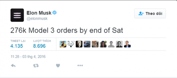 Thông tin được Elon Musk đăng tải trên Tweeter ngày 03/04/2016