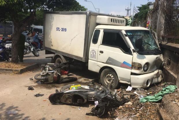 Tại hiện trường chiếc xe tải đâm vào vách tường, đầu xe biến dạng. Hai chiếc xe máy bị hư hỏng nặng.