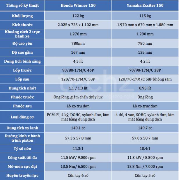 Tương quan thông số kỹ thuật của Winner và Exciter.