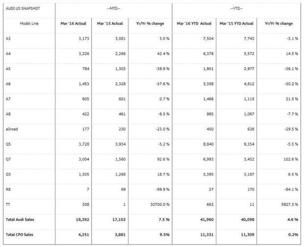 Với tổng số 18.392 chiếc xe được bán ra tháng trước, tăng 7,5 phần trăm so với năm 2015, Audi đạt kỉ lục lần thứ 63 liên tiếp trong tháng Ba. Có được con số này là nhờ sự ra đời của A4 và sự phổ biến ngày càng rộng rãi của những chiếc SUV tại Mỹ. Bán chạy nhất là xe Q5 với 3.728 chiếc, tiếp theo là A4 và A3 với doanh thu lần lượt là 3.226 và 3.173 chiếc.