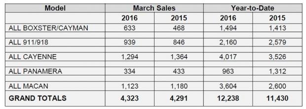 Tại Bắc Mỹ, tháng trước Porsche đã bán ra 4.323 chiếc xe Boxster/Cayman, 911/918, Cayenne, Panamera và Macan, con số này vào cùng kỳ năm ngoái là 4.291 chiếc. Cayenne đứng đầu với 1.294 chiếc, theo sát sau đó là Macan với 1.123 chiếc. Trong ba tháng đầu năm, thương hiệu này đã tăng trưởng 7,1% với tổng số 12.238 chiếc xe được bán ra.