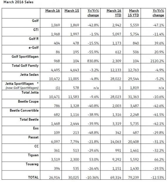 Tuy nhiên tổng doanh thu của Volkswagen lại giảm 10,36% còn 26.914 chiếc xe được bán ra. Điển hình là Jetta Sedan, vì nó chiếm gần một nửa doanh thu của hãng, tiếp theo là Passat, gia đình nhà Golf và Tiguan. Trong quý một năm 2016, doanh thu của hãng đã giảm xuống 12,5% còn 69.314 chiếc.