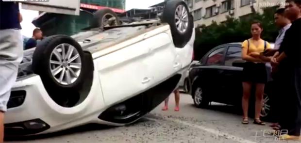 Hình ảnh trong video tại hiện trường cho thấy, chiếc hatchback màu trắng nằm phơi bụng giữa đường phố. Cảnh sát đã có mặt ngay lập tức để giải quyết vụ việc.