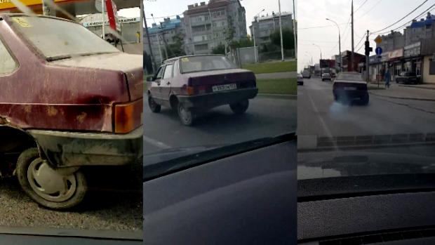 Chiếc ô tô cũ màu mận bị liệt 1 bánh nhưng vị tài xế vẫn cho xe tiếp tục di chuyển trên đường. Không những thế, người này còn tăng tốc khiến chiếc bánh liệt mài xuống đường bốc khói khét lẹt.