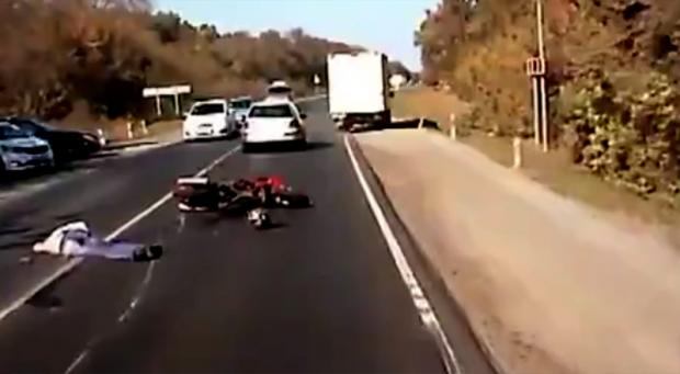 Hình ảnh được ghi lại từ canmera hành trình của chiếc ô tô đi phía sau. Tai nạn kinh hoàng đã xảy ra khi người lái mô tô cố vượt chiếc xe tải màu trắng. Trong tình huống vượt, chiếc mô tô xảy ra va chạm với xe tải khiến xe đổ xuống đường.